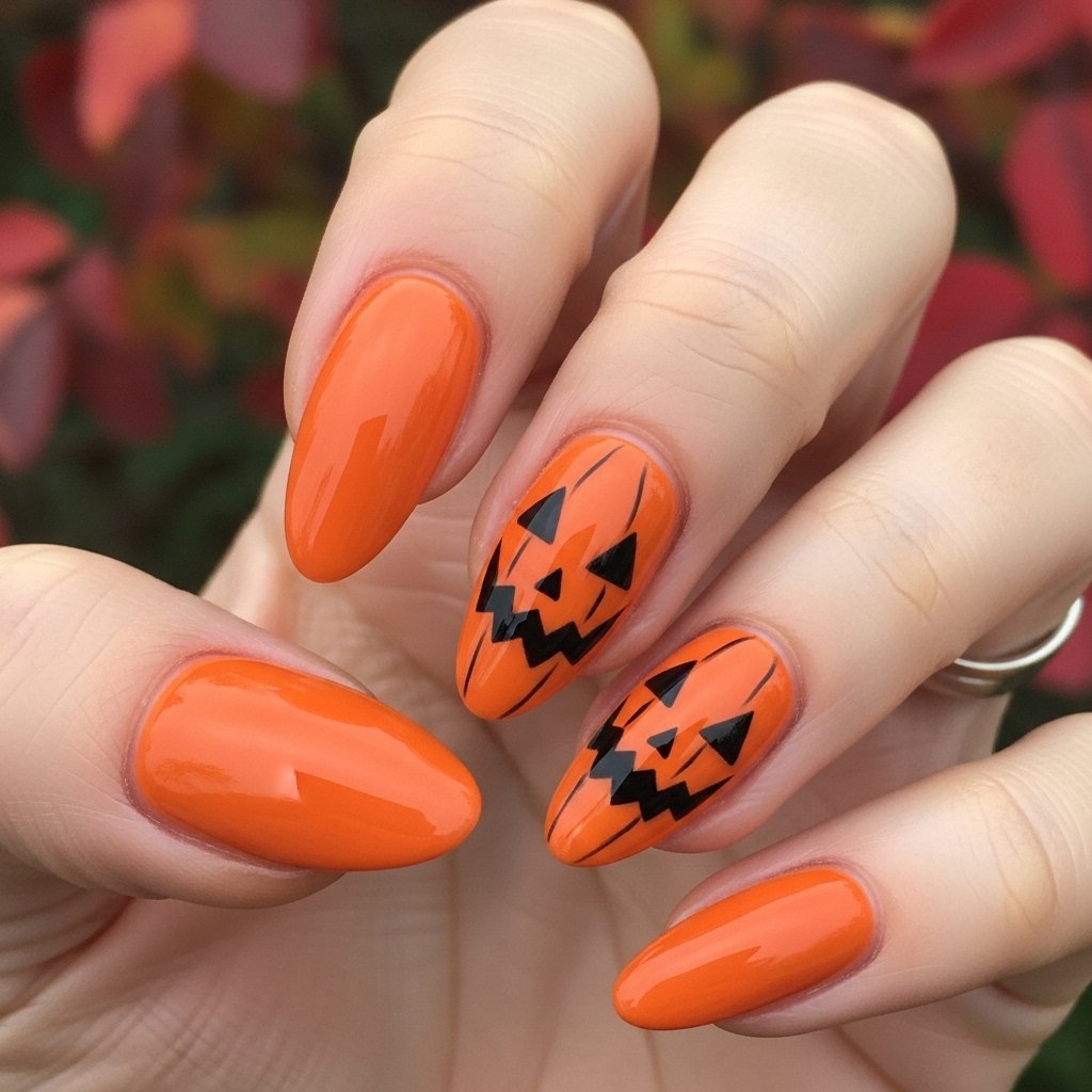 Bright pumpkin-orange nails are a must-have for the season. Pair them with black tips or jack-o’-lantern designs for the ultimate Halloween feel.