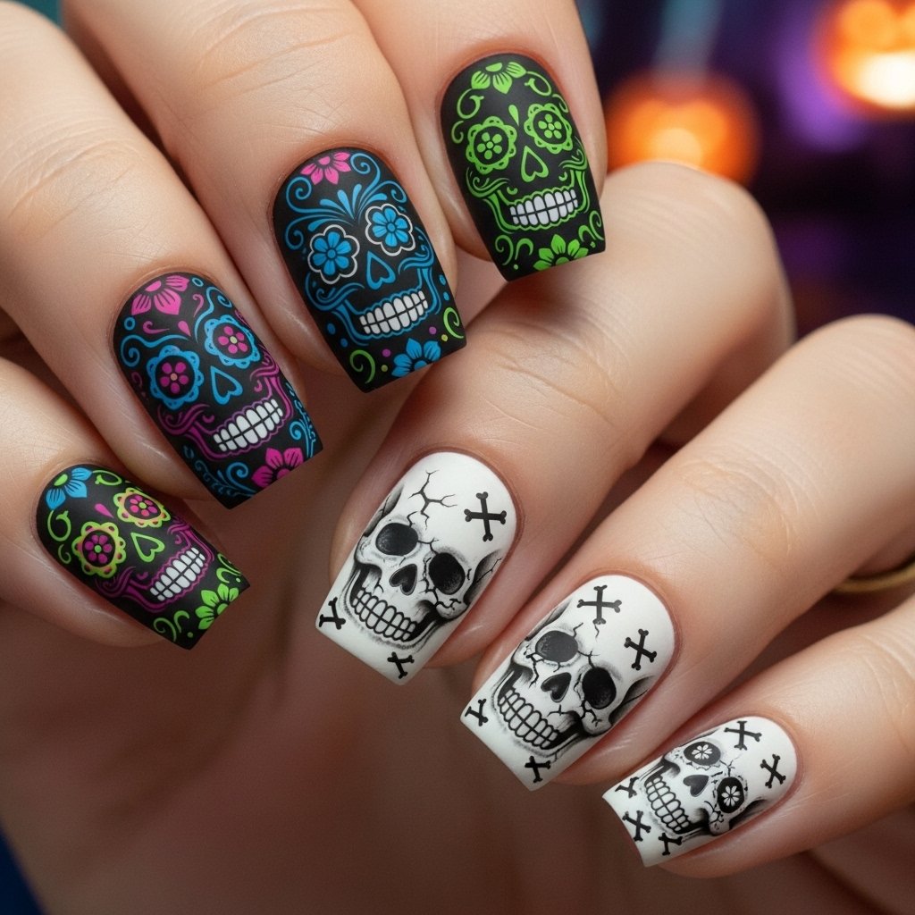 Detailed skull art on a neutral base makes for an edgy and festive Halloween nail design. Try sugar-skull-inspired patterns for a colorful twist.