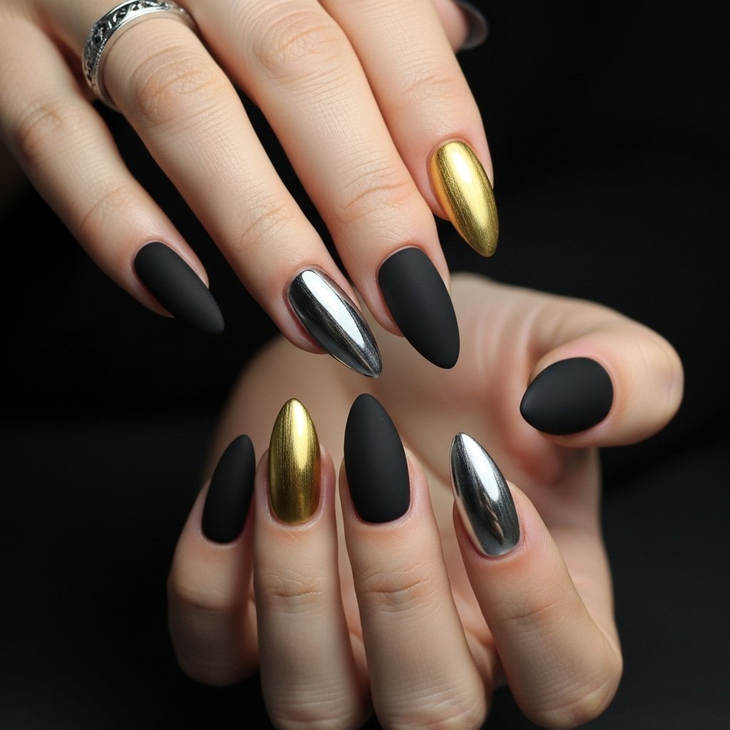 Matte black nails with silver or gold metallic tips give an elegant yet mysterious Halloween vibe. This style works well for those who prefer a minimal look.
