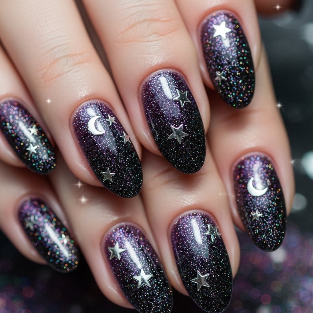A mix of black and purple glitter polish creates a magical witch-inspired nail look. Add tiny star stickers or moons for extra charm.