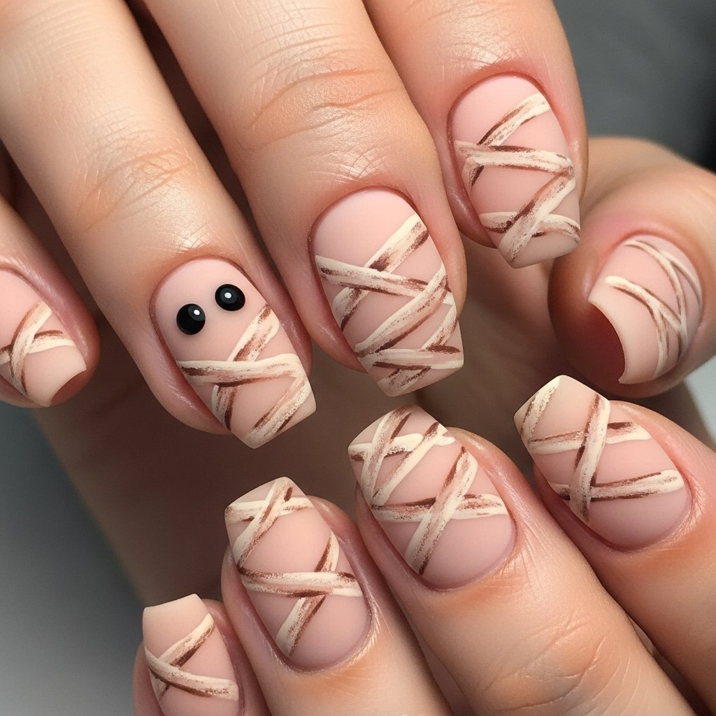 Wrap-like lines over a white or nude base create a creepy mummy effect. Add a pair of little eyes for a playful finish.