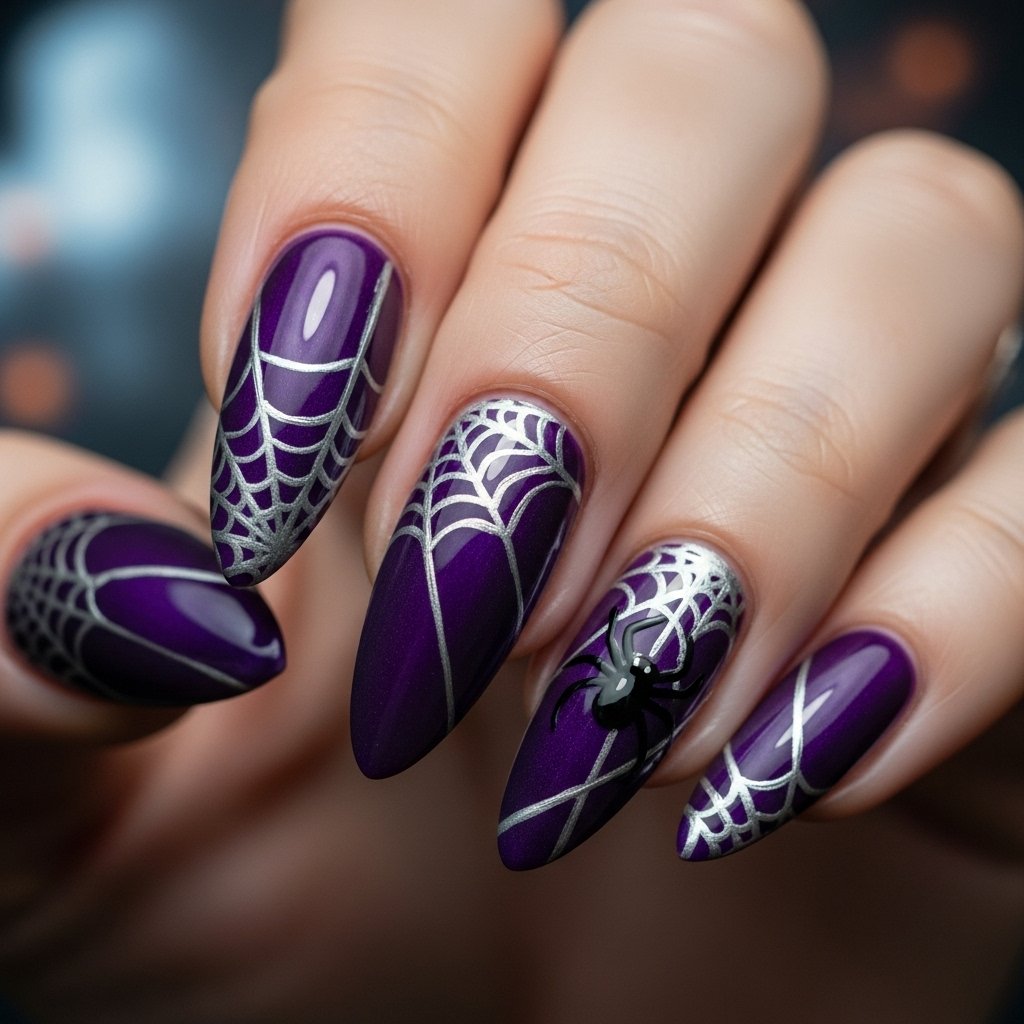 Add thin white or silver spider webs over a black or deep purple base. This simple yet striking design works beautifully on both short and long nails.