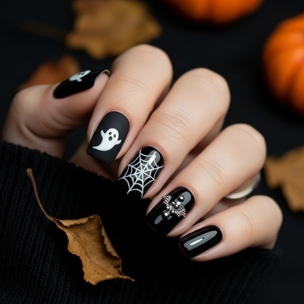 You can never go wrong with classic black nails for Halloween. Matte or glossy finishes instantly give a mysterious vibe, making them the perfect base for other spooky nail art.