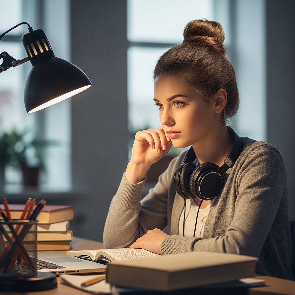 The top knot is trendy, easy to create, and keeps your hair out of the way while studying.